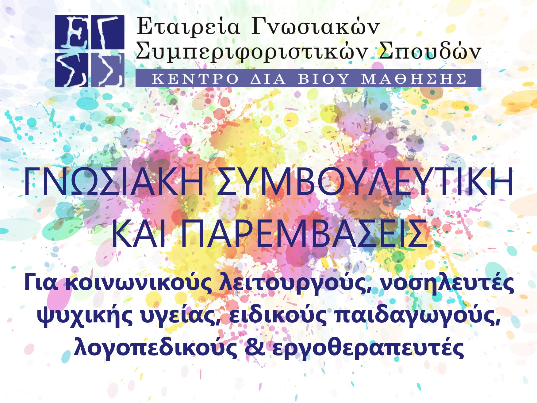 Η Εταιρεία Γνωσιακών Συμπεριφοριστικών Σπουδών διοργανώνει σεμινάριο με θέμα "Γνωσιακή συμβουλευτική και παρεμβάσεις", το οποίο απευθύνεται σε ειδικούς του χώρου της ψυχικής υγείας και της ειδικής αγωγής (κοινωνικούς λειτουργούς, νοσηλευτές ψυχικής υγείας, ειδικούς παιδαγωγούς, λογοπεδικούς, εργοθεραπευτές, συμβούλους επαγγελματικού προσανατολισμού κ.ά.) που καλούνται να προσφέρουν ψυχοκοινωνικές υπηρεσίες αυτόνομα ή στο πλαίσιο της δομής που υπηρετούν.
