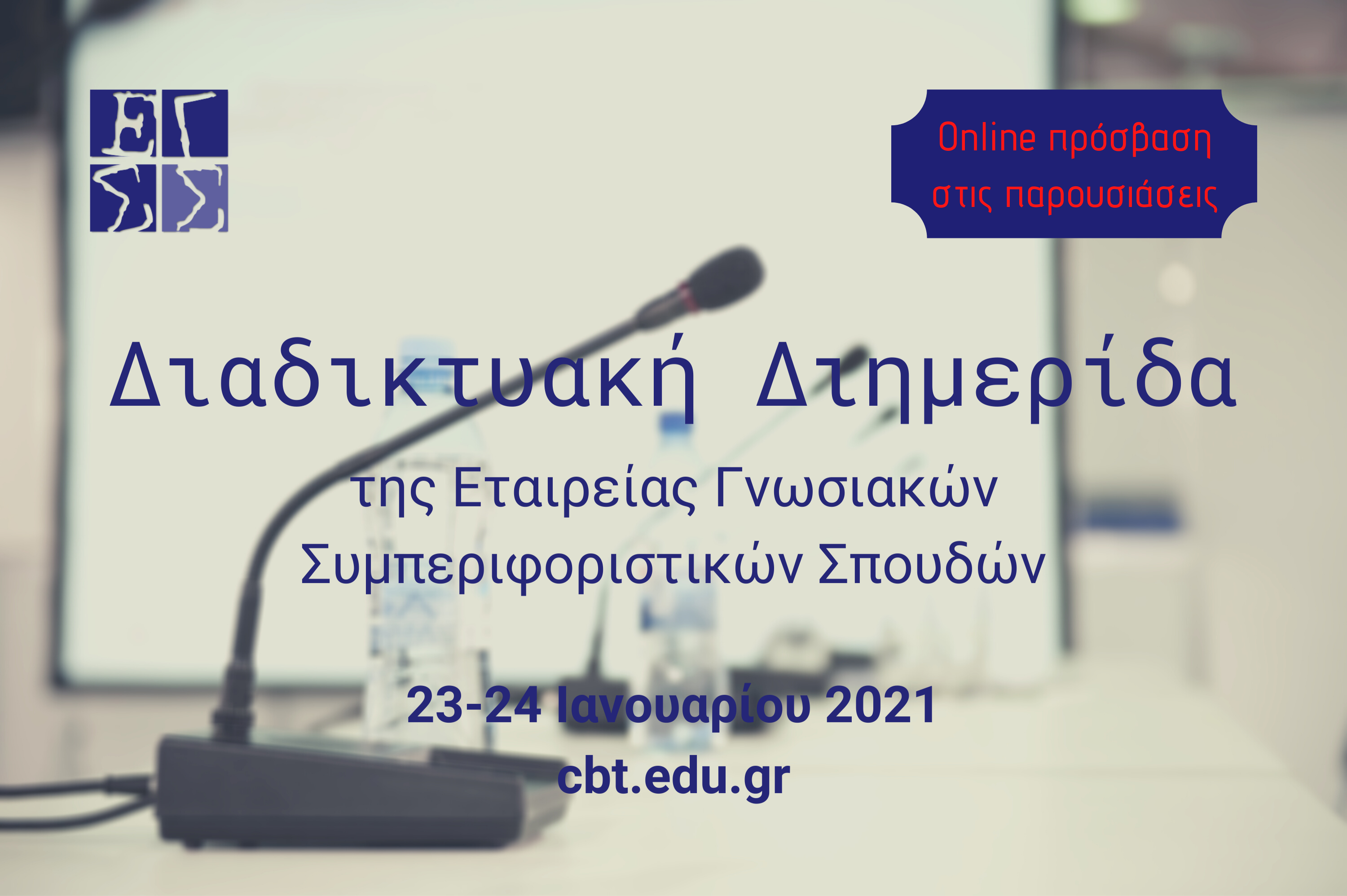 Η Εταιρεία Γνωσιακών Συμπεριφοριστικών Σπουδών διοργανώνει Σεμινάριο βασικής εκπαίδευσης στη “Θεραπεία Εστιασμένη στη Συμπόνια” (Compassion Focused Therapy-CFT) με την Δρ. Αλεξάνδρα Χρυσάγη. Το Εργαστήριο θα πραγματοποιηθεί σε τρία σαββατοκύριακα στις 17-18 Απριλίου 2021, 15-16 Μαΐου 2021 και 5-6 Ιουνίου 2021.